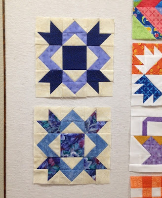 Where is the time going?? I can't believe it's already May. I got a little sewing done over the weekend. I've been playing around with blocks that use flying geese units. The technique that I am teaching in the current quilt class session is the No Waste Flying Geese method. The link is to a really good resource on how to do this method. I decided to go with the Golden State Warriors colors (blue and yellow/gold) for these blocks. The bottom block on the left is for the Crossroads quilt along. I think it came out pretty good! And it has flying geese units as well!